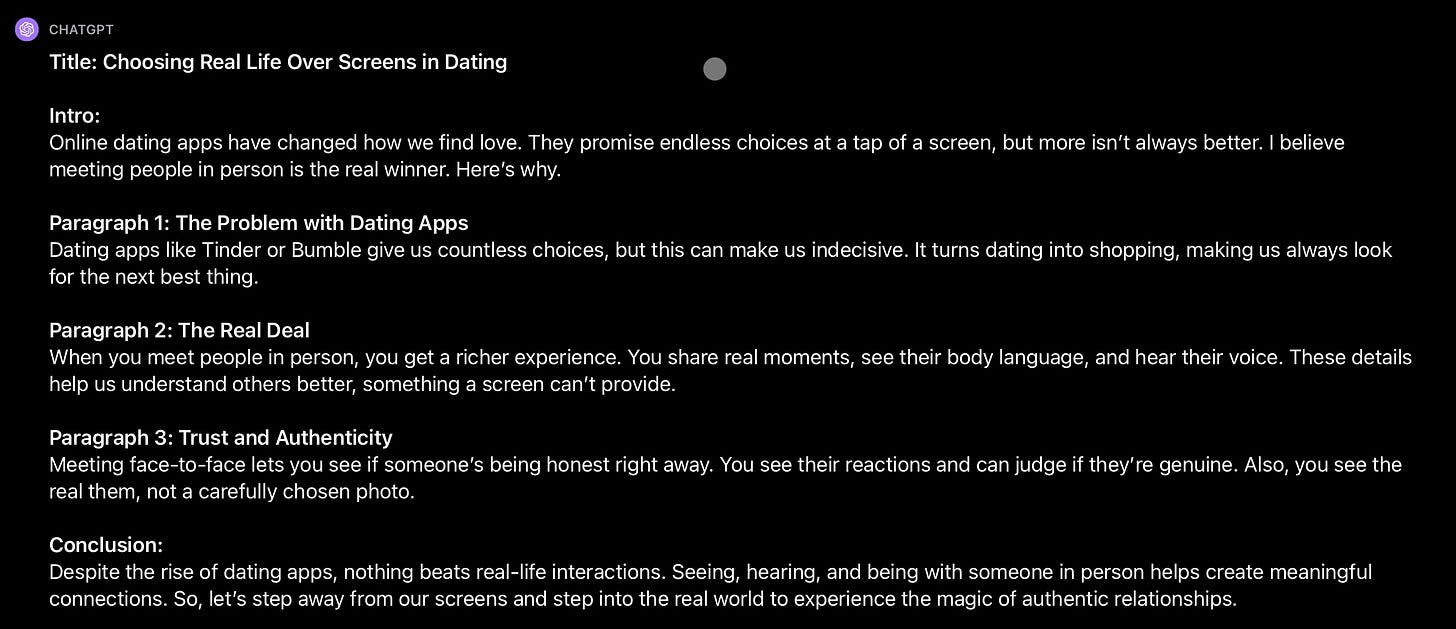 “You are a university rhetoric professor. You write with clarity, simplicity, and structure. Please write a persuasive 5-paragraph essay that analyzes dating app trends and argues why meeting people in person is more effective.”