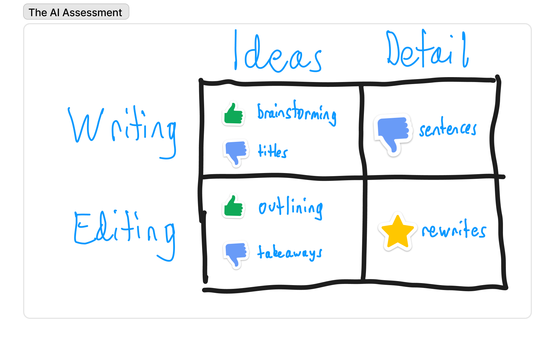 AI is great at brainstorming, outlining, and rewriting — tasks which the end reader never sees, but helps the author clarify thinking. AI is not good at writing compelling titles, takeaways, or sentences yet, where every word matters a lot in contributing to an author’s unique voice and message.