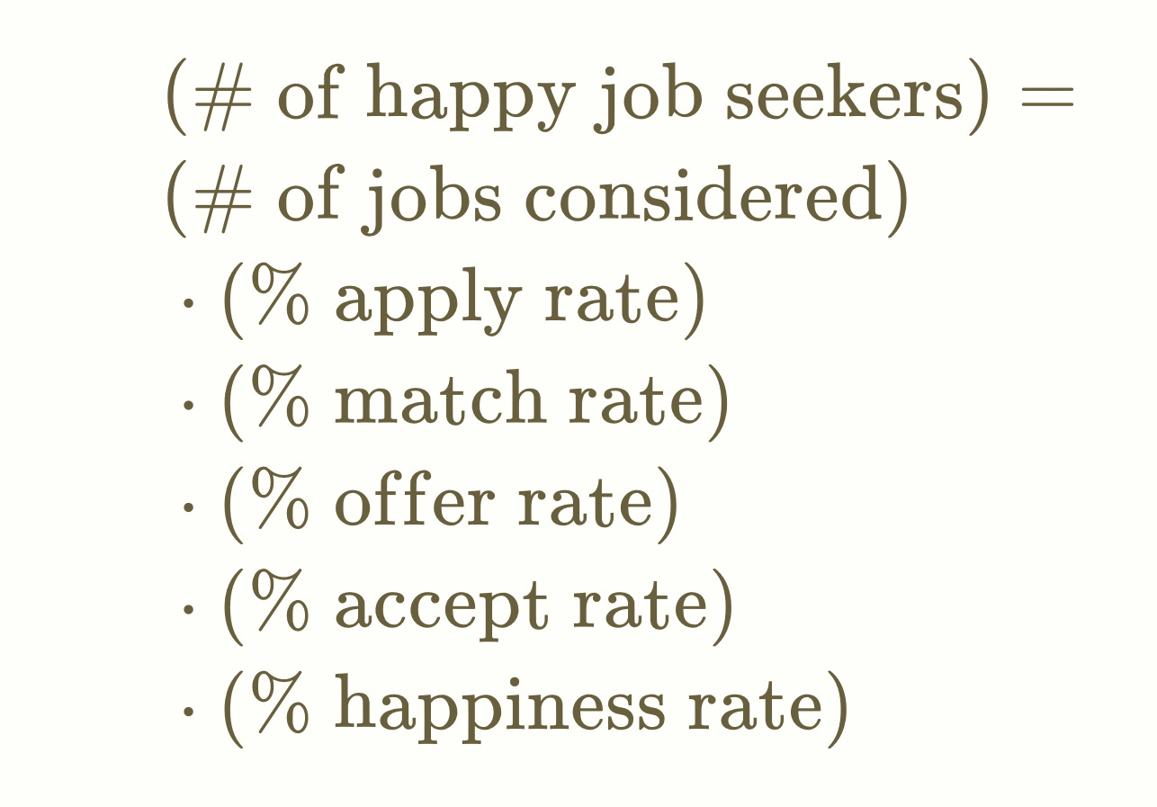We can start with a goal to increase the number of job seekers who found and got hired by jobs they wanted. The ideal outcome is a job seeker who applies for the first job they see, gets hired immediately, and is happy with the result. The worst outcome is a job seeker who applies for 100 jobs and doesn’t get hired by any of them.