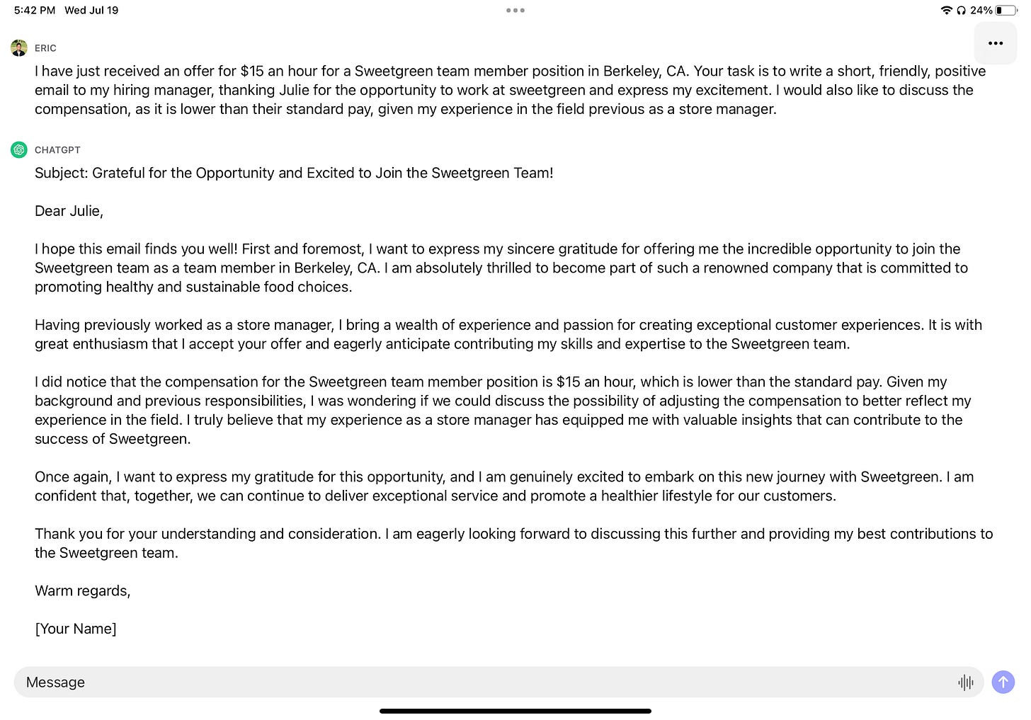 In the third screenshot, I used OpenAI to compare a high school candidate’s profile to a job description for a Sweetgreen Team Member. And though the job description preferred candidates with previous experience working in restaurants and handling food, the high school student showed candidacy through a high GPA and leadership positions in clubs and intramural teams. Without this kind of intelligence, typically this candidate would be automatically rejected because the rule a hiring manager would add is “only candidates with 1+ years of experience.”