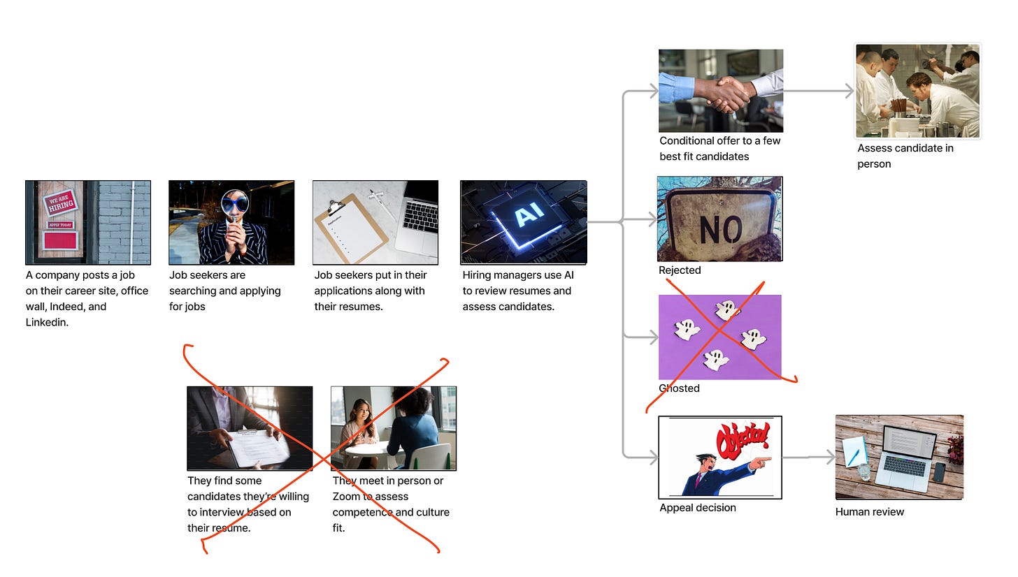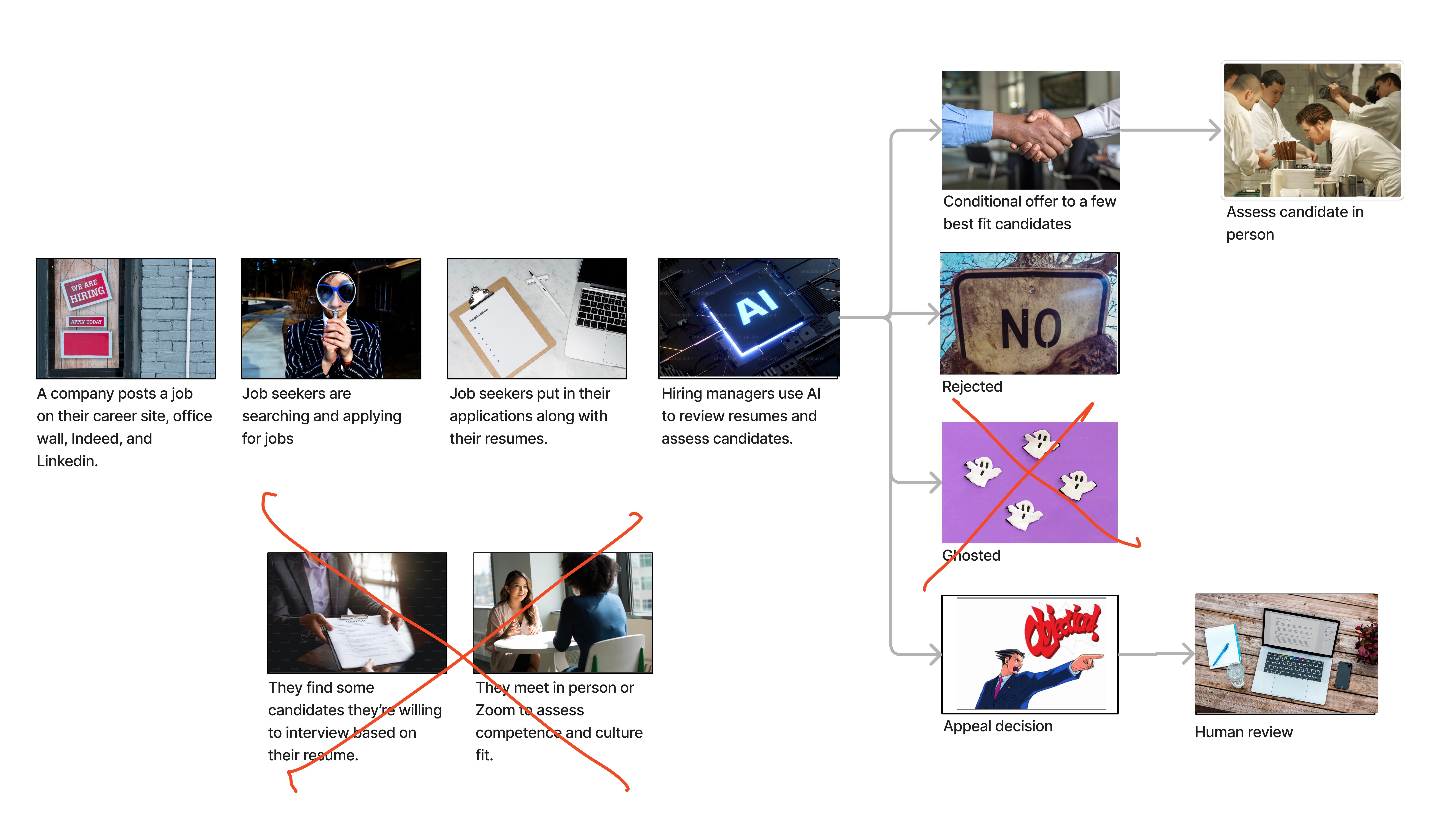 Let’s see how we can improve the match rate. A ton of time is spent screening resumes by recruiters and hiring managers. How could we increase the percentage of applications that meet an employer’s criteria? How could we convince employers to give more chances to more people? Imagine an AI that does the initial resume screen on the behalf of a hiring manager. The AI can surface candidates who pass a criteria based on judgment, not arbitrary keywords.