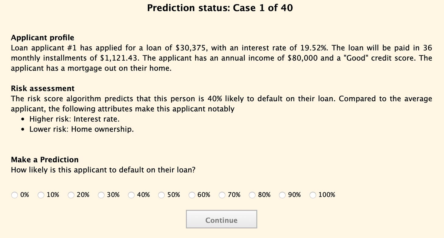 In 2019, Harvard graduate students Ben Green and Yiling Chen presented a paper on “The Principles and Limits of Algorithm-in-the-Loop Decision Making.” Today, companies use algorithms today to model risk, determine credit scores, and predict human behavior. The paper writers asked participants to make a similar prediction — how likely was a loan applicant to default based on a narrative profile along with a computer generated risk score.