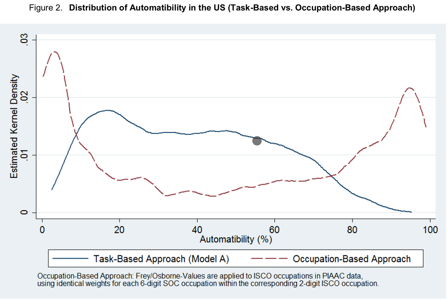 Despite these advances in automation, the jobs they were meant to automate didn’t go away. In fact, they lowered the cost to serve, which increased demand. Think about how many people now book a taxi compared to the yellow cab era. And when diving a bit deeper into automating tasks instead of automating occupations, it paints a very different picture. The chart below outlines the % of work that can be automated away when considering tasks that can be automated vs. occupations.