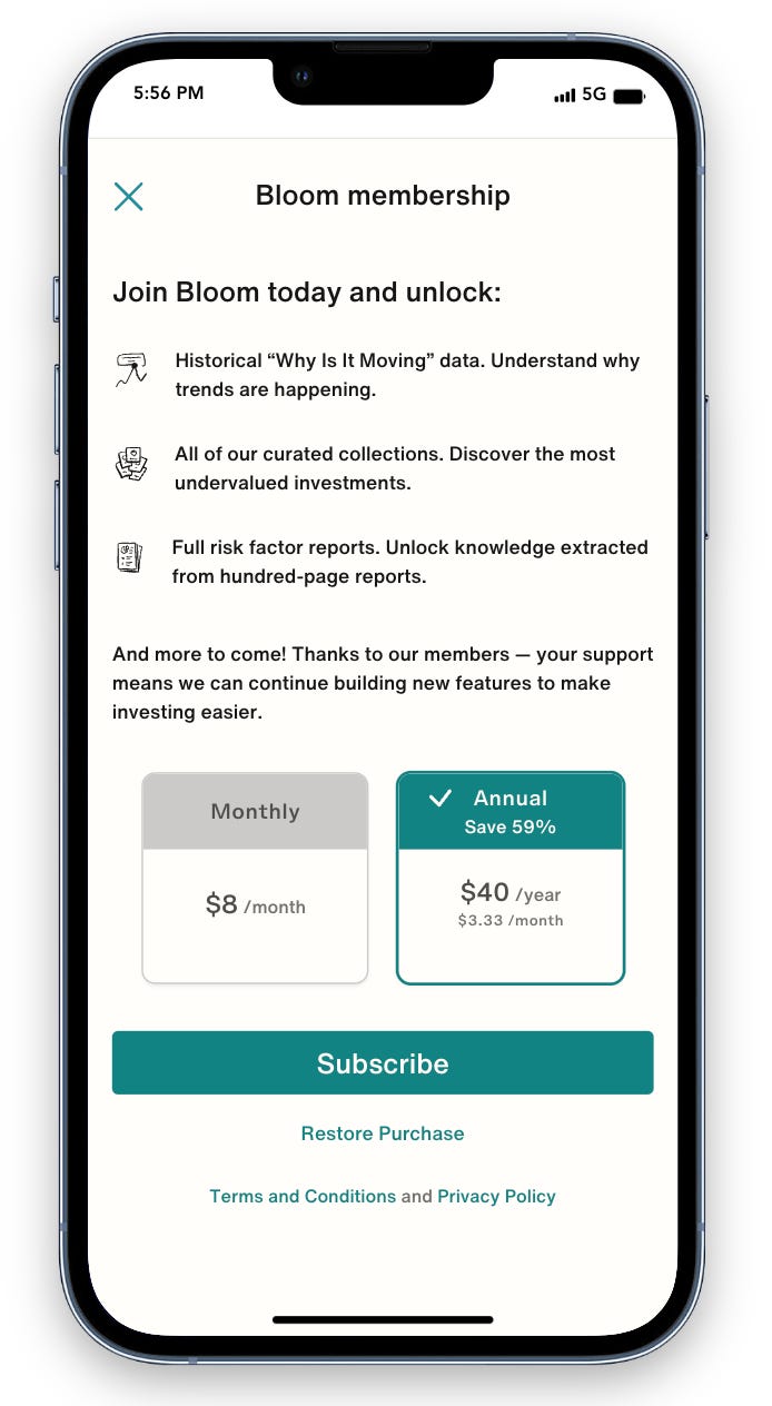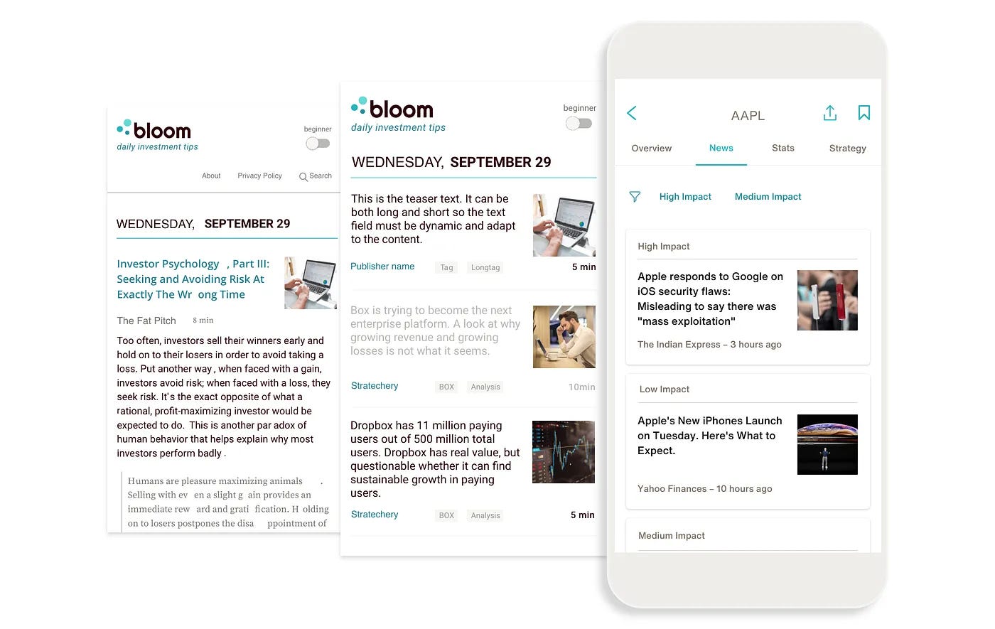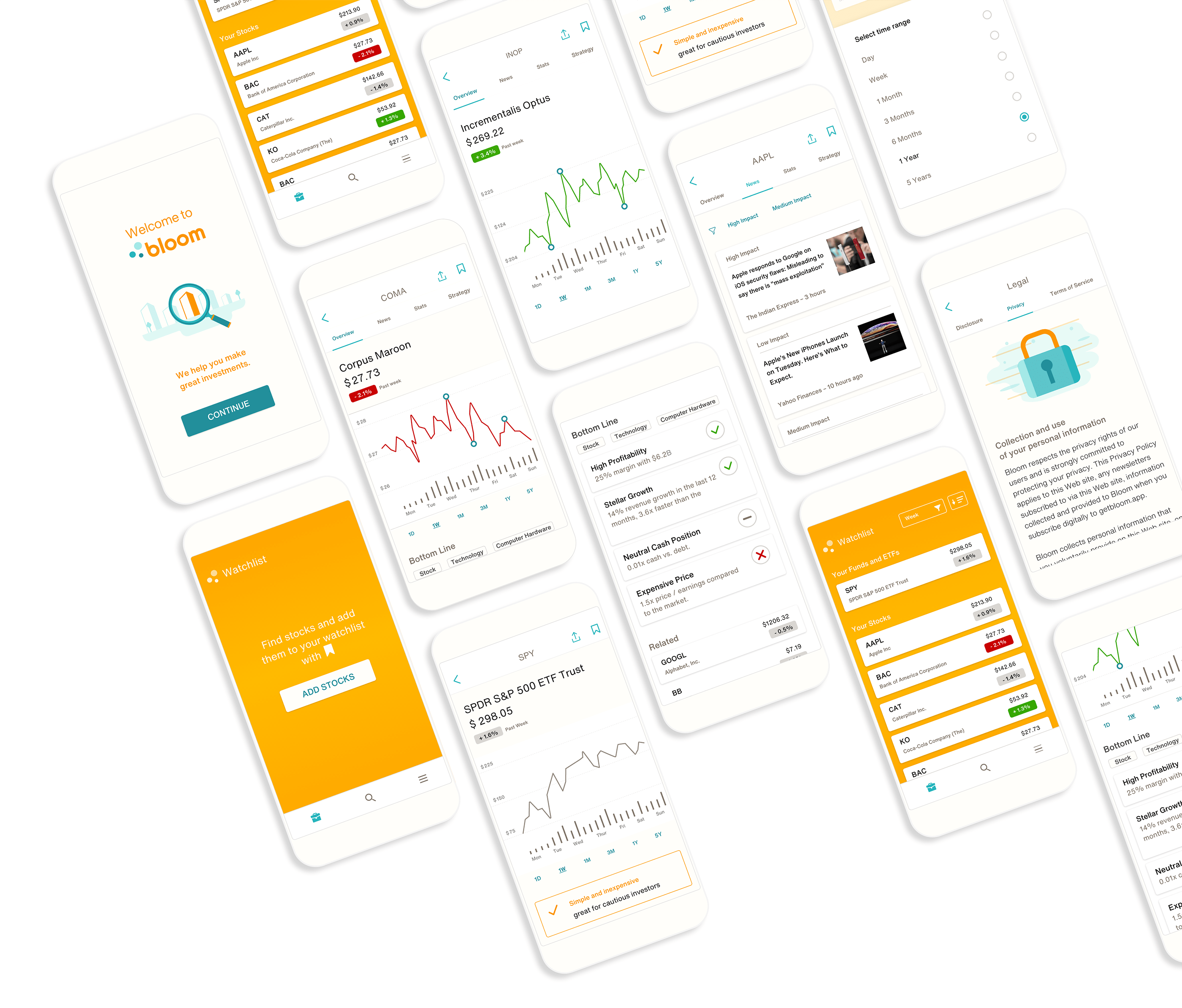 Bloom is a simple way to find high quality companies at good prices. Bloom helps investors save time researching stocks. It filters out the noise, summarizing financial statements and showing relevant news that affects stock prices.
