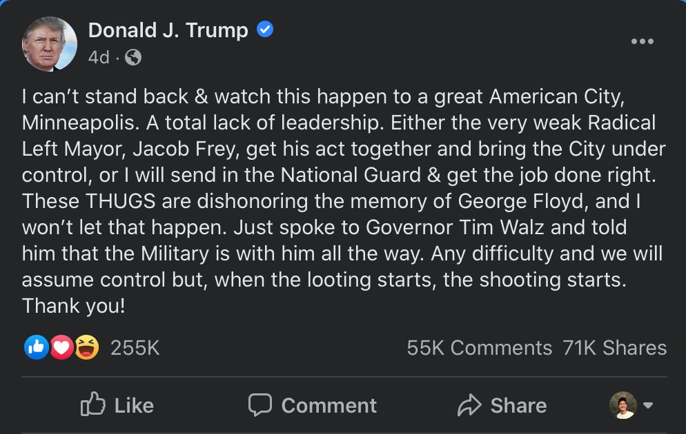 Free expression gives us the power of dissent. It gives us the power and platform to debate ideas. It’s a core principle of American democracy. But it can be weaponized. Is Trump’s call for a use of state force considered a call for violence, especially when said state forces have been filmed unjustly murdering Black Americans, especially when the phrase for ‘when the looting starts, the shooting starts’ was previously used by White Supremacist George Wallace?